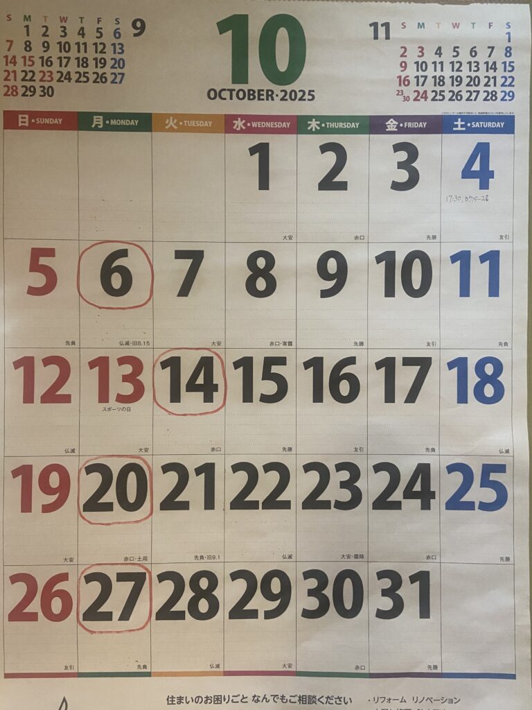 10月の定休日のお知らせです。10月もよろしくお願い致します
